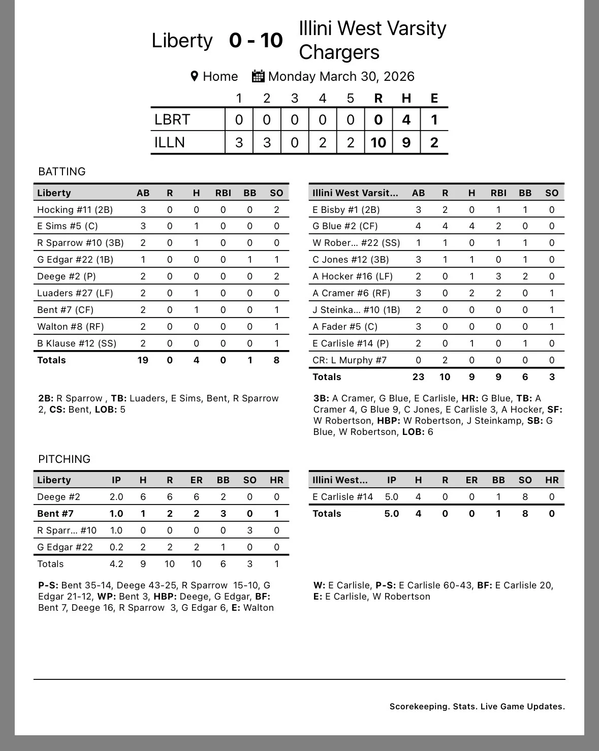 March 30th Illini West Charger Baseball vs Liberty